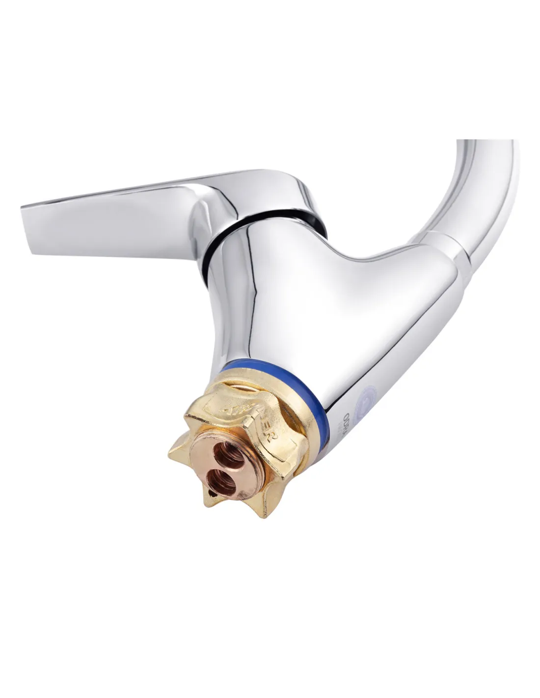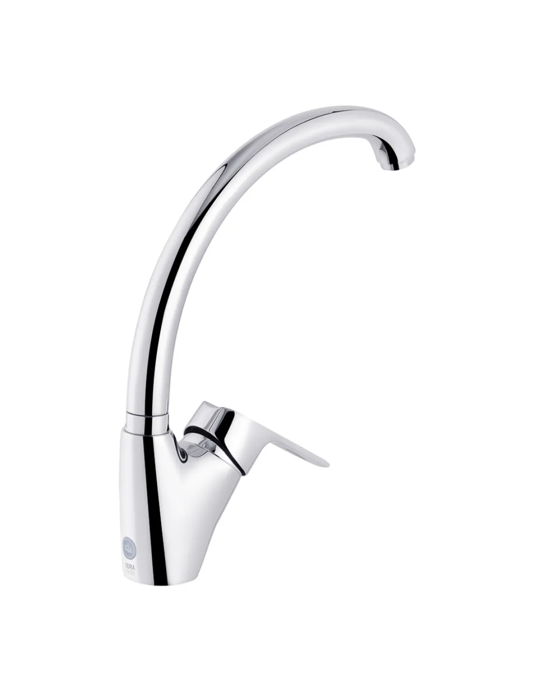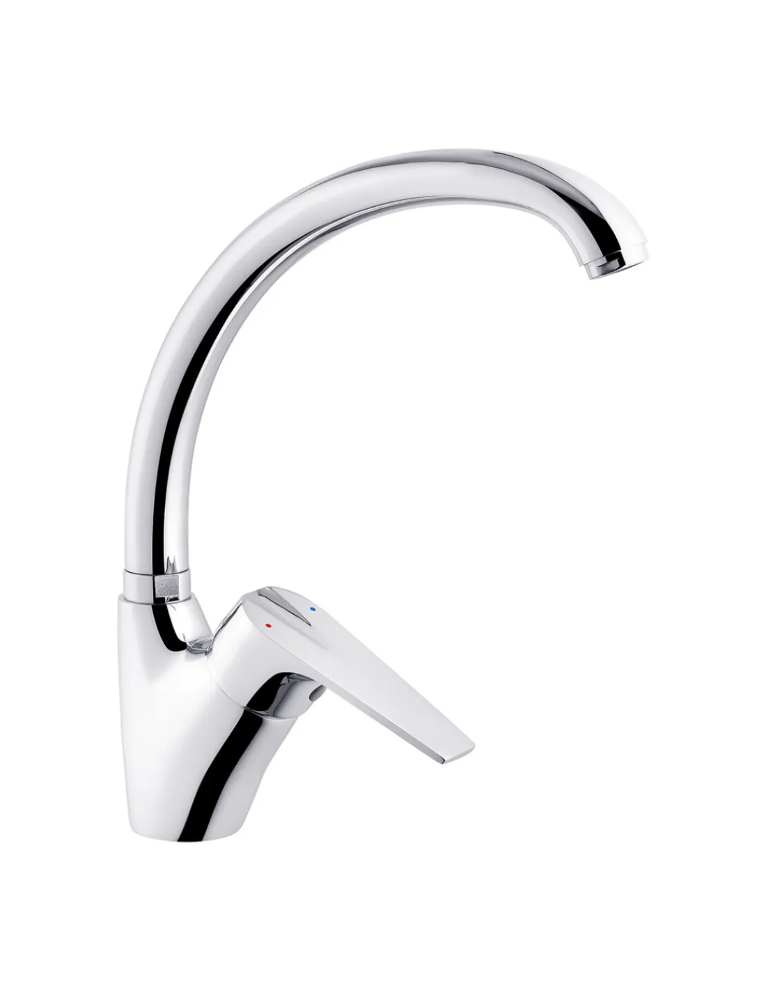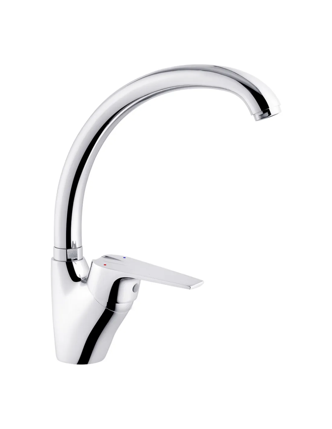 Тип кухонного смесителя – однорычажный, оснащен поворотным С-образным изливом, длина излива – 22 см, высота излива 24 см. Рабочее давление до 3 Бар, расход воды до 13 л/мин. Излив вращается на 360 градусов, что позволяет его использовать для кухонных моек с двумя или тремя чашами.