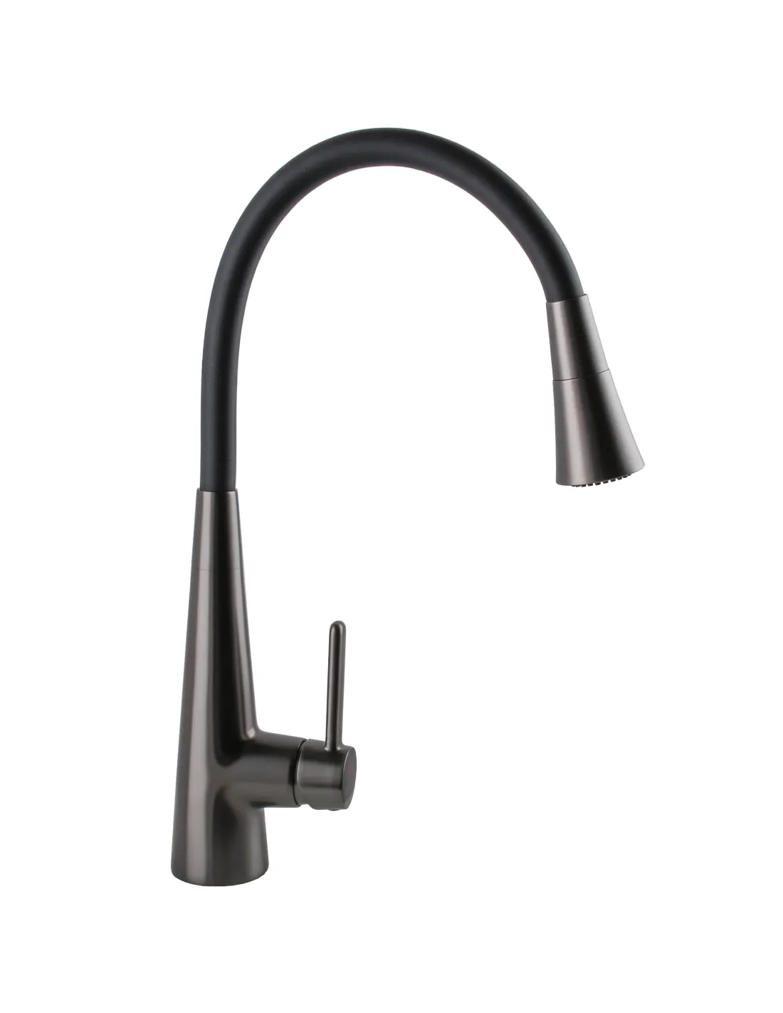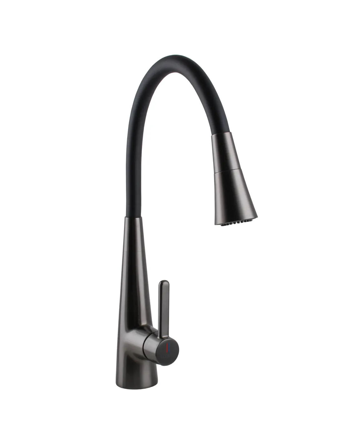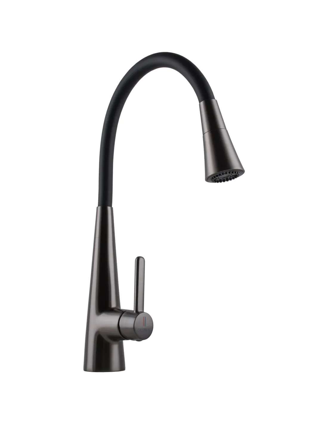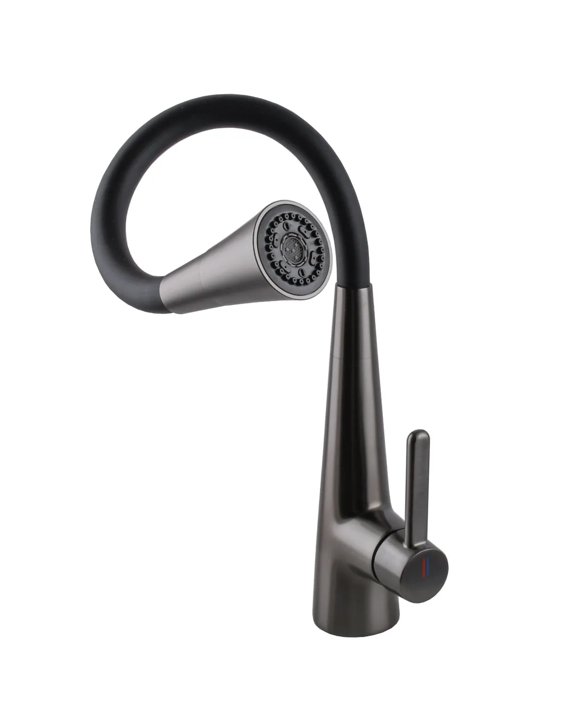 Тип кухонного смесителя – однорычажный, оснащен поворотным гибким изливом черного цвета, благодаря чему повышается функциональность и удобство использования крана. Рабочее давление до 3 Бар, расход воды до 13 л/мин. Излив гнется под удобным углом, что позволяет его использовать для кухонных моек с двумя или тремя чашами.