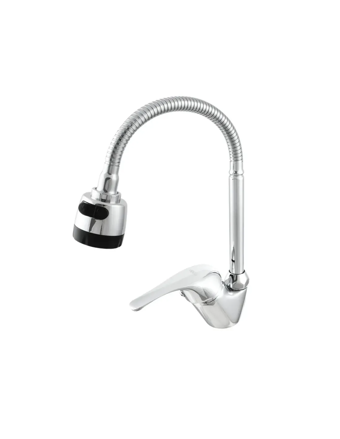 Тип кухонного смесителя – однорычажный, оснащен поворотным изливом. Рабочее давление до 3 Бар, расход воды до 13 л/мин. Излив вращается на 360 градусов, что позволяет его использовать для кухонных моек с двумя или тремя чашами.