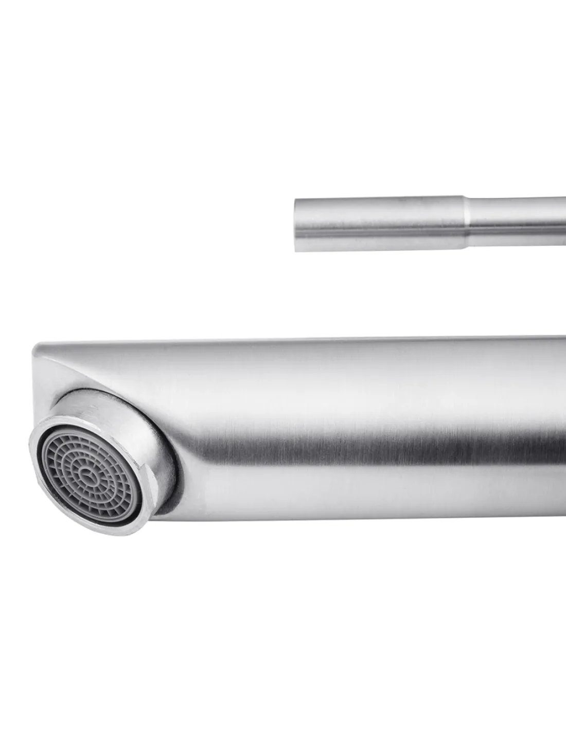 Смеситель изготовлен из нержавеющей стали SUS 304. Покрытие смесителя – брашированная сталь, которая не затирается при длительном использовании. В процессе изготовления применены современные технологии производства. Излив стационарный, изделие литое.