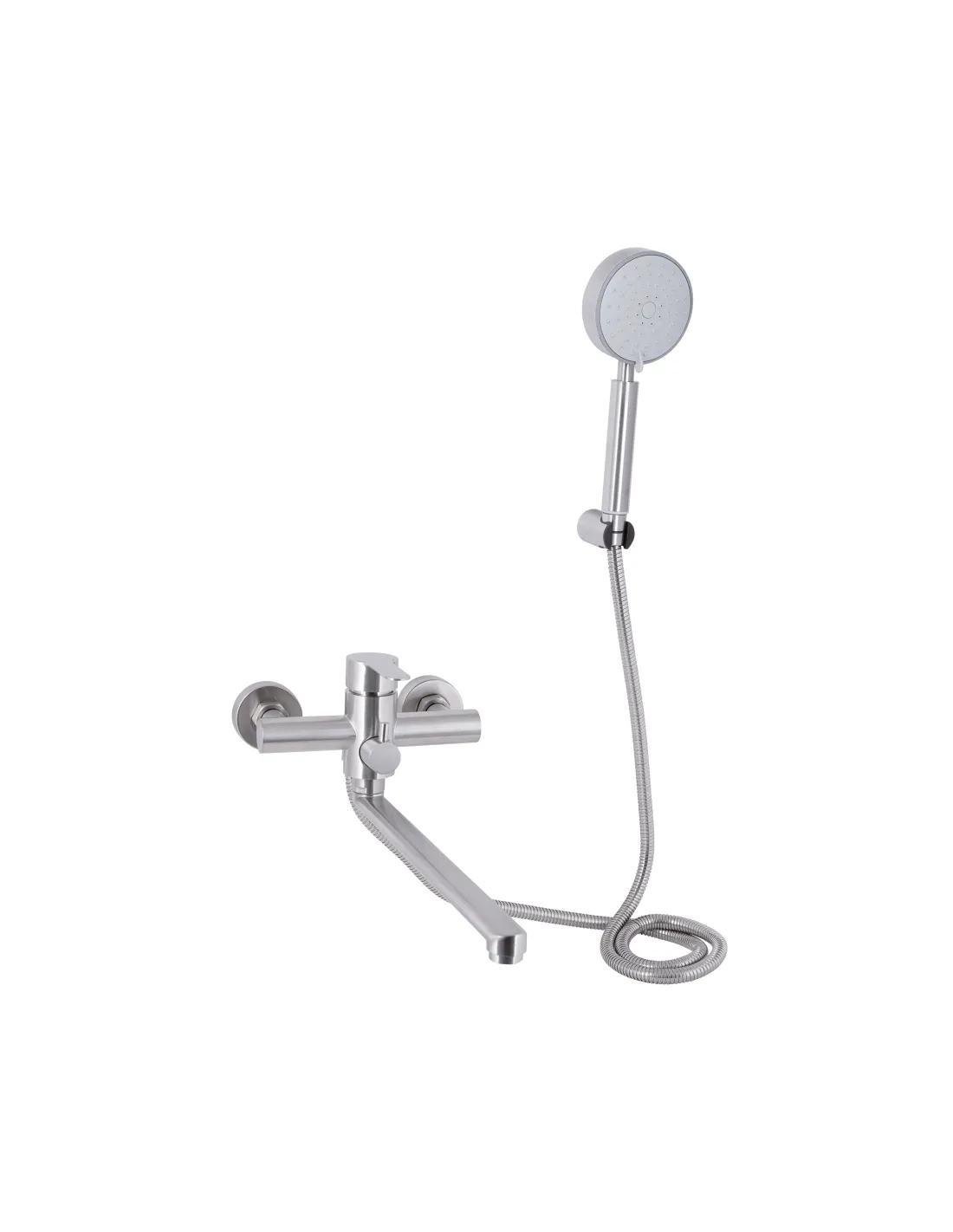 Смеситель для ванны Brinex Pure - предназначен для регулировки температуры и подачи воды с установленным напором в ванной комнате. Используется в ванной комнате для ванны и умывальника. Изготовлен из нержавеющей стали, фактура поверхности - матовая. Кран имеет современный дизайн, прост в установке и использовании. Установка наружного типа, на стену с помощью двух гаек (эксцентриков). Смеситель оборудован евро переключателем воды с крана на душевую лейку, что подчеркивает его функциональность. Длина излива 350 мм. Излив поворотного типа, что позволяет его использовать и для ванной и для умывальника. В комплекте также поставляется душевой шланг, лейка и крепление к стене для ручного душа. Управление краном - однорычажное, также рычаг используется для регулировки температуры и напора подачи воды. Тип подключения - жесткие подводы для воды. Гарантия на изделие 12 месяцев. Страна производитель - Китай.