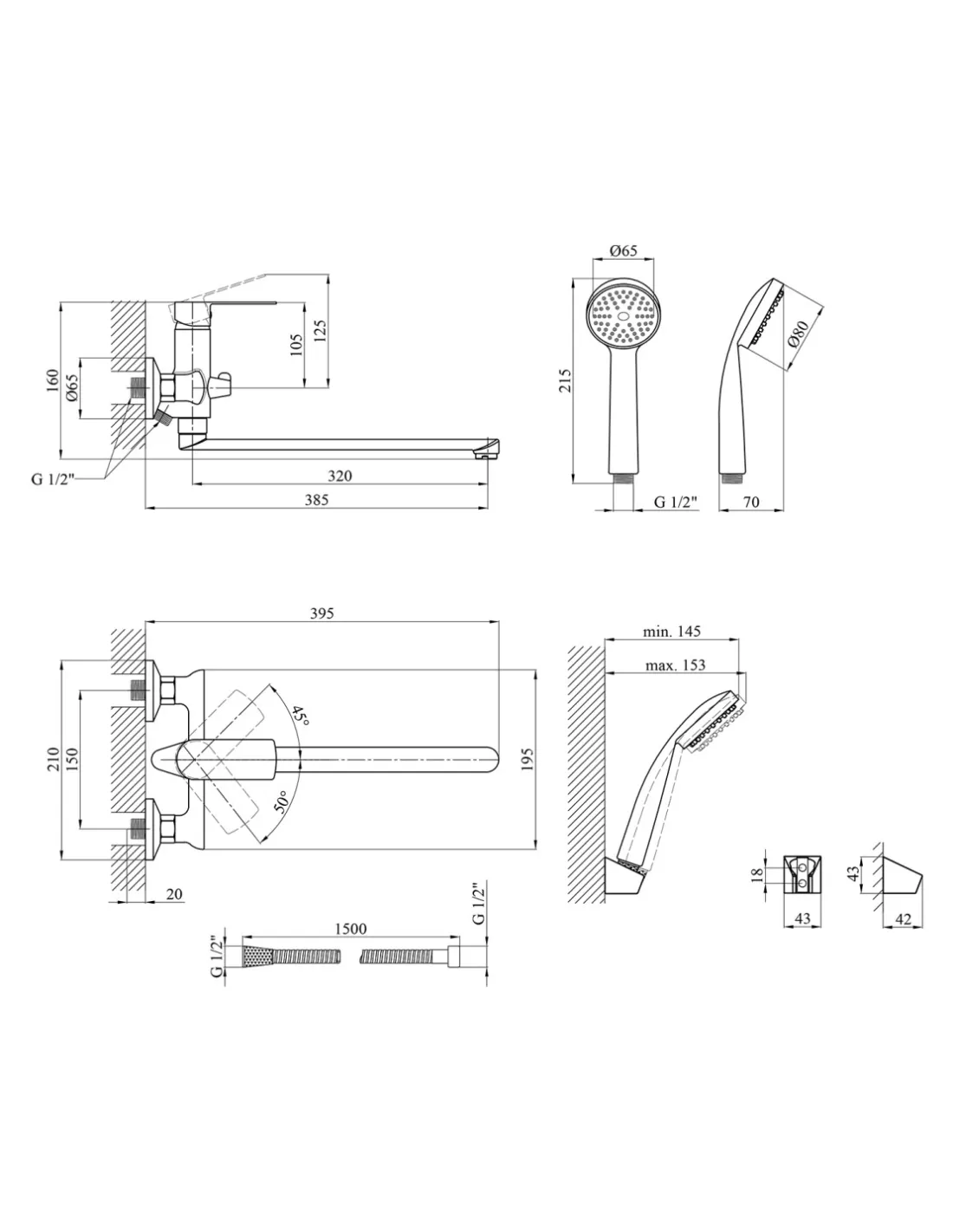 - Шланг душевой 1500 мм,