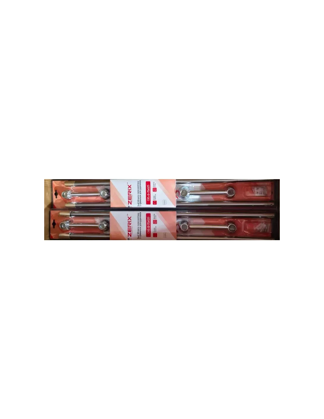 Встановлення штанги Zerix CRS-D-75x125 здійснюється за принципом механізму розпіру. Достатньо розсунути штангу на кілька сантиметрів ширше за отвор і встановити її в потрібному місці, застосувавши невелике зусилля. Внутрішній пружинний блок або різьбовий фіксатор створюють необхідну напругу для жорсткого утримання конструкції. М`які наконечники на торцях забезпечують надійне зчеплення навіть із глянсовою плиткою та гасять вібрації під час руху штори.