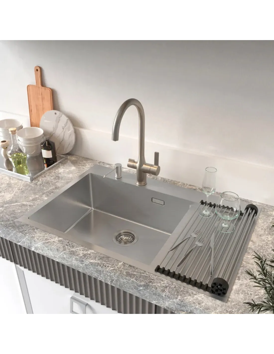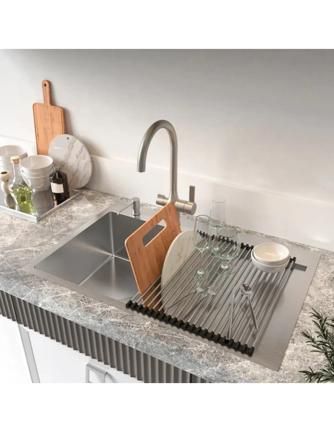 Сушарка для посуду Kroner KRP Matte - SCH4333-2 — сучасний та практичний аксесуар, призначений для зручного сушіння посуду. Завдяки компактній конструкції сушарка ідеально підходить для невеликих кухонь і може використовуватися як на робочій поверхні, так і над раковиною. Виготовлена із міцної нержавіючої сталі з покриттям із неслизького харчового силікону, що забезпечує стійкість та безпеку при використанні. Витримує температуру до 220 градусів за Цельсієм. Габарити виробу – 8х340х460 мм. Форма – прямокутна, поверхня – глянсова/матова.