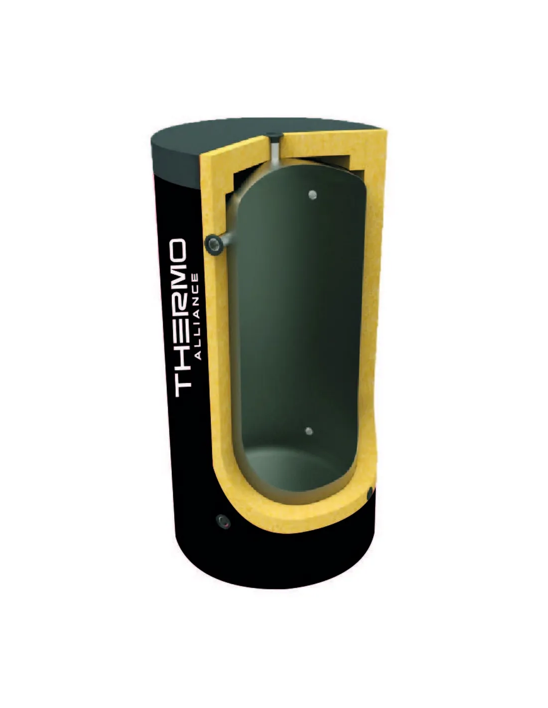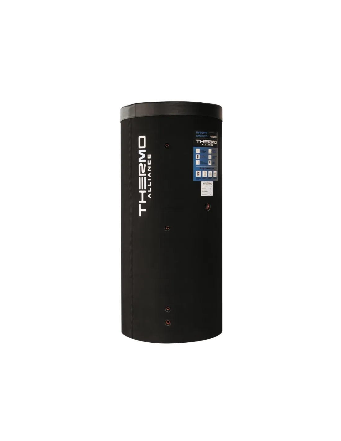 Теплоаккумулятор Thermo Alliance TA-ТАМ-00 предназначен для накопления, сохранения, передачи теплоносителя от источников непостоянного действия таких как: газовые и твердотопливные котлы, теплонасосы, гелиоколлекторы и другие источники работающие в одной системе. Буферный бак снабжен верхним витым теплообменником, изготовленным из нержавеющей стали. Змеевик нагревает воду для бытовых нужд, в традиционной сети с газовым котлом выполняет роль бойлера горячего водоснабжения. Теплоизоляция толщиной 6 см сделана из пенополиуретана / пенополистирола, которая помогает сохранять накопленную энергию.