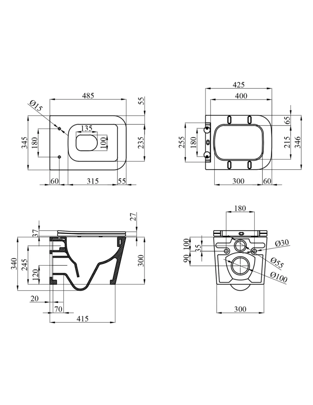 - Габариты унитаза (ДхШхГ): 345х340х485 мм;