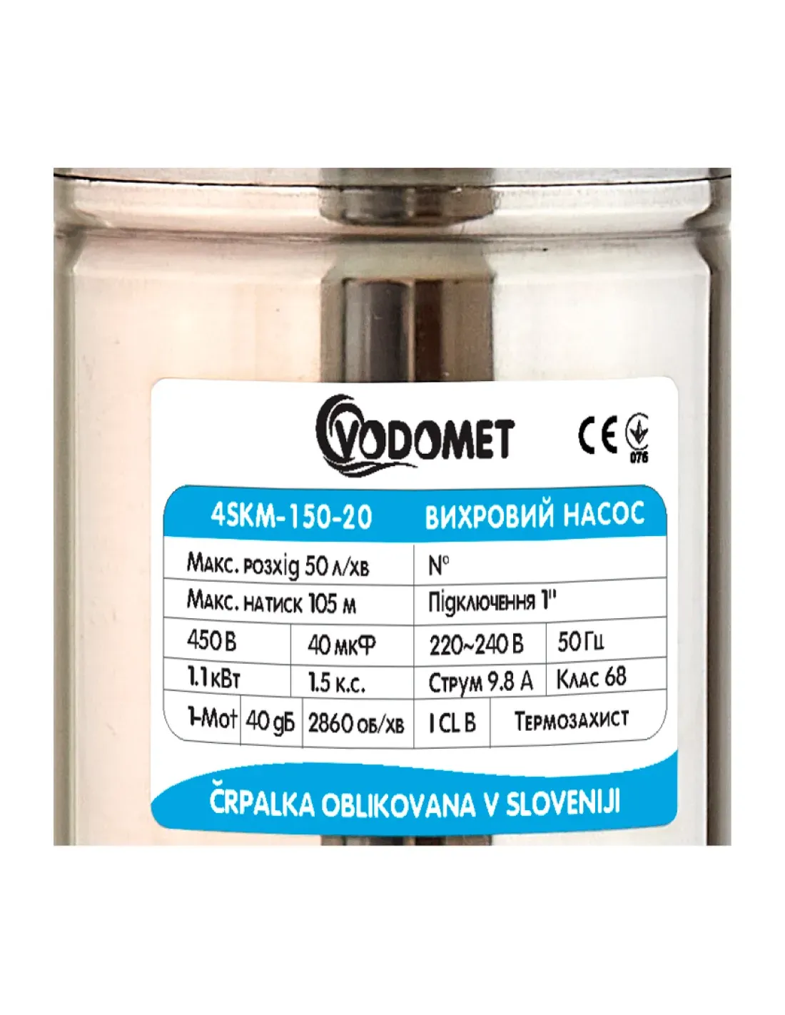 Вихровий глибинний насос Vodomet 4SKM-150-20 1,1 кВт, кабель 20 метрів призначений для забору води з артезіанських свердловин та глибоких джерел для забезпечення питною водою житлових будинків та промислових об`єктів. Використовується в системах, де потрібне високе піднесення води на значні відстані. Насос відрізняється підвищеною потужністю та продуктивністю. Нержавіючий корпус та латунна крильчатка гарантують тривалий термін експлуатації у зануреному стані. Укомплектований кабелем довжиною 20 метрів та виносним блоком управління. Максимальний тиск: 105 метрів. Продуктивність насоса – 3.0 куб.м/година або 50 літрів за хвилину. Гарантія 24 місяці. Країна виробник - Словенія.