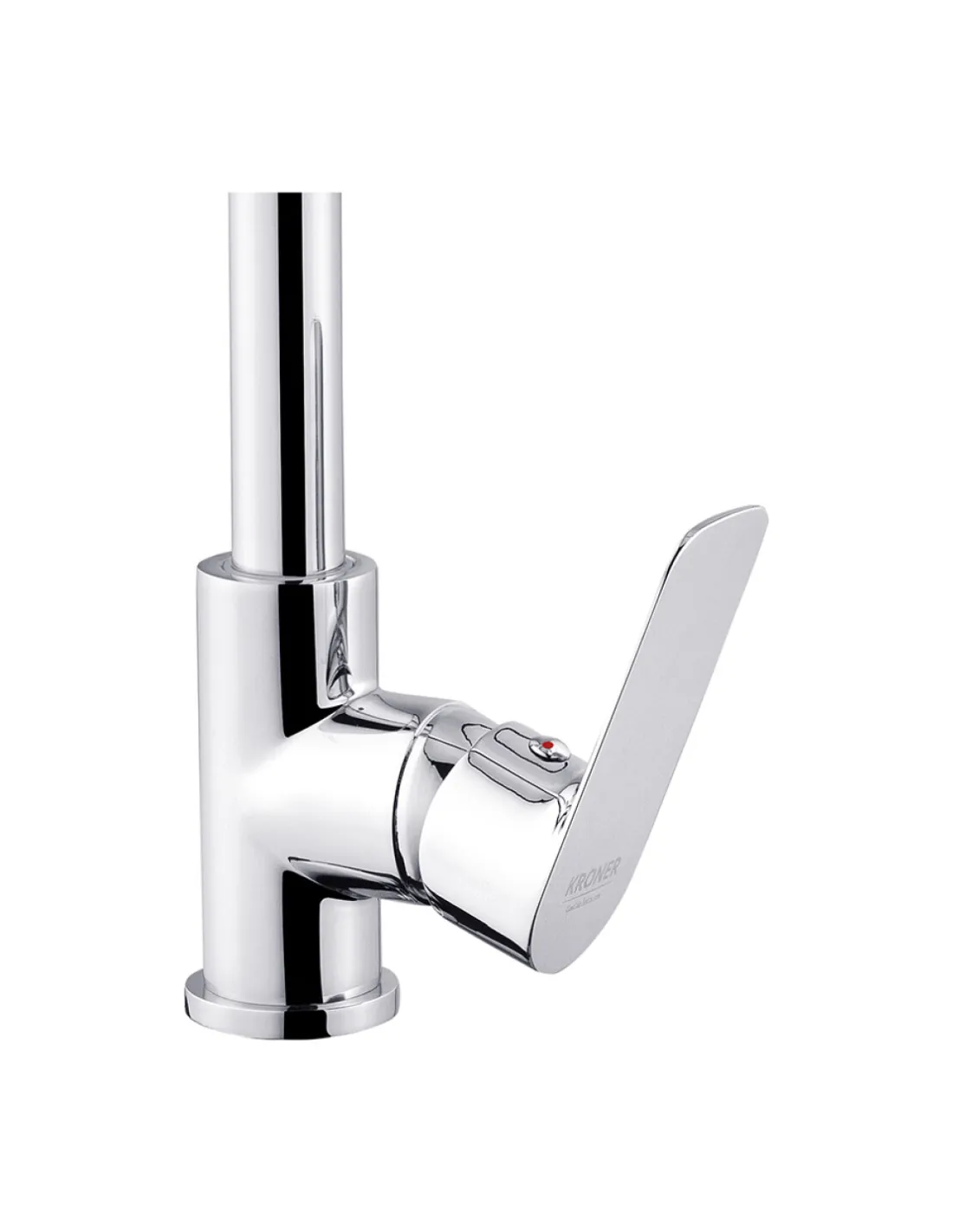 Змішувач для кухні Kroner KRM Main - C030 гармонійно впишеться в інтер`єр кожної кухні. Призначений для підведення на кран гарячої та холодної води, їх змішування та подачі з потрібним натиском користувачеві. Конструктивні особливості полягають в одноважільному управлінні та кріпленні гайкою. Змішувач виконаний за сучасними технологіями та стандартами із силуміну. Механізм змішування – картридж діаметром 35 мм. Картридж із високоякісного матеріалу забезпечує довговічність служби завдяки високому ресурсу пластин. Навіть у разі підвищення тиску у водопровідній системі картридж витримує навантаження. При перемиканні та регулюванні напору води пристрій працює плавно та безшумно.