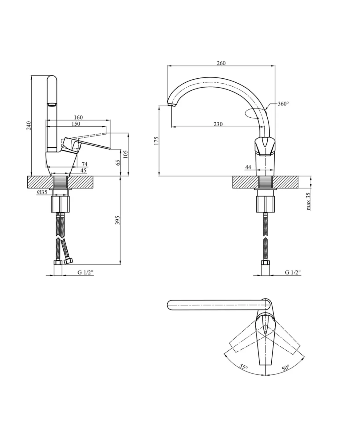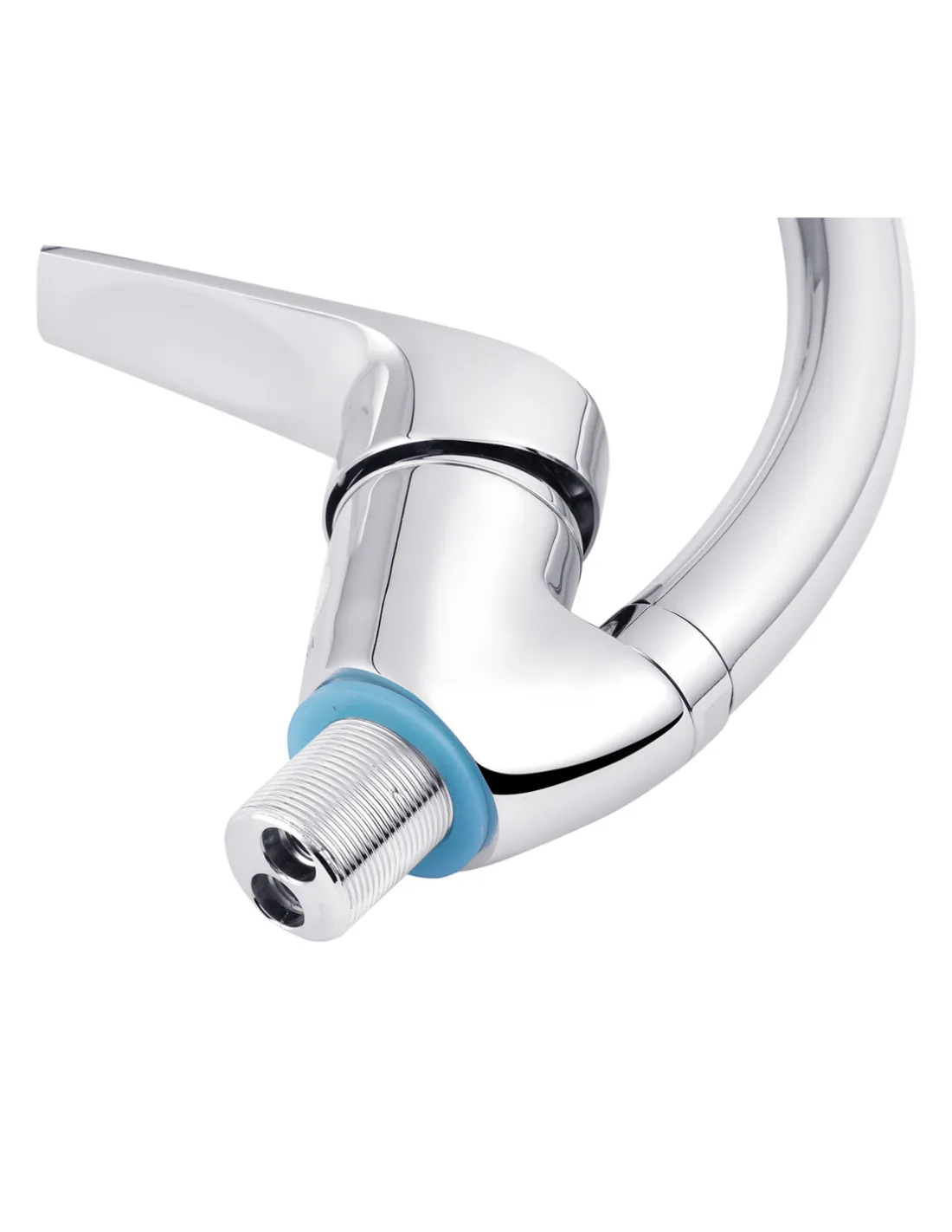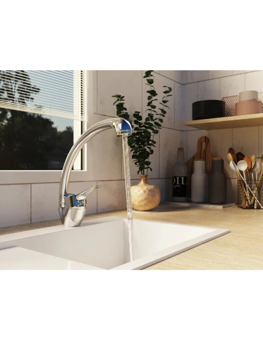 Тип кухонного змішувача – одноважільний, оснащений поворотним С-подібним виливом, довжина виливу – 23 см, висота виливу 17,5 см. Робочий тиск до 3 бар, витрата води до 13 л/хв. Вилив обертається на 360 градусів, що дозволяє його використовувати для кухонних мийок із двома або трьома чашами.