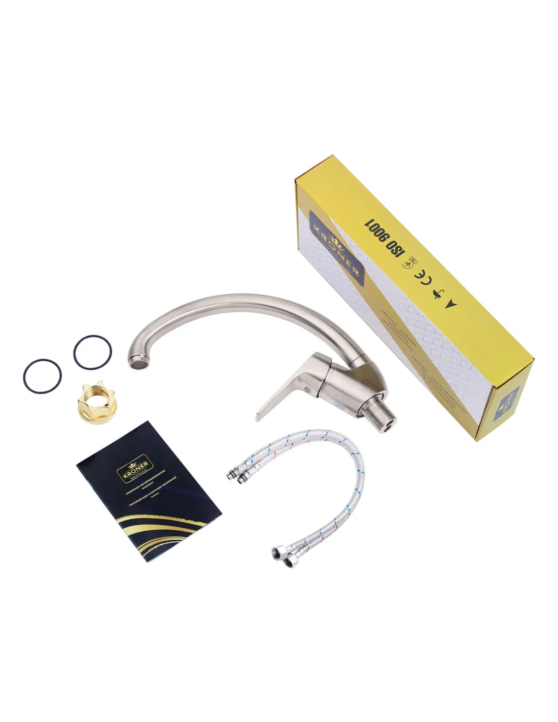 Змішувач для кухні Kroner KRM Odra - N035 - призначений для змішування гарячої та холодної води. Використовується на кухні. Встановлюється на кухонну мийку або стільницю. Матеріал виробу крана – силумін. Виготовлений у сучасному стилі, в кольорі сталевий із брошурованою поверхнею. Монтаж змішувача - врізний за допомогою затискної гайки. Тип підключення до водопроводу - гнучкі шланги, що підводяться. Гарантія: 36 місяців. Країна-виробник: Німеччина.
