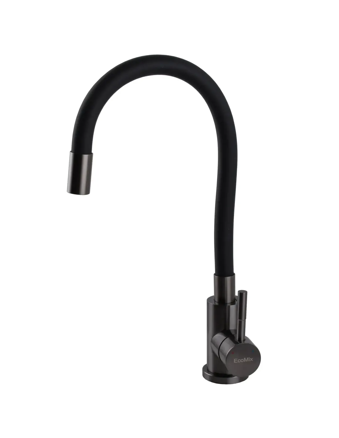 Змішувач для кухні Ecomix Stella - призначений для змішування гарячої та холодної води. Використовується на кухні. Встановлюється на кухонну мийку або стільницю. Конструктивна особливість змішувача - гнучкий гофровилив, що підвищує його функціонал при використанні. Матеріал виробу крана – нержавіюча сталь. Виготовлений у сучасному стилі, у чорному кольорі з матовою поверхнею. Монтаж змішувача - врізний за допомогою затискної гайки. Тип підключення до водопроводу - гнучкі шланги, що підводяться. Гарантія: 12 місяців. Країна-виробник: Китай.
