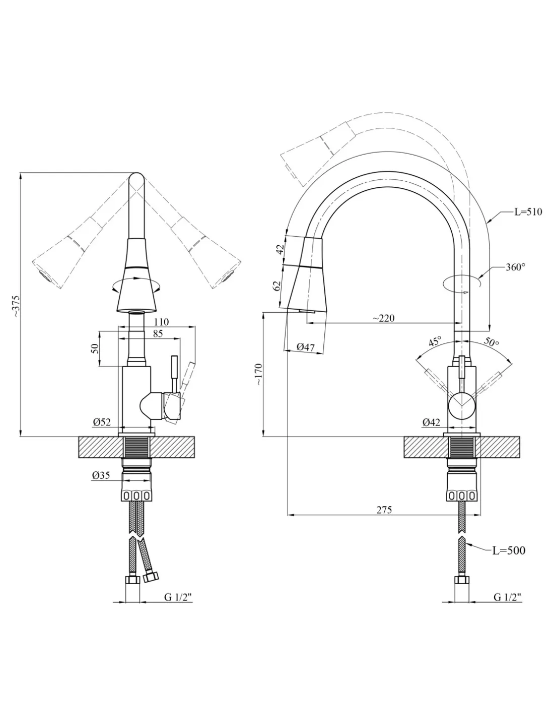 - Висота всього змішувача: 375 мм,