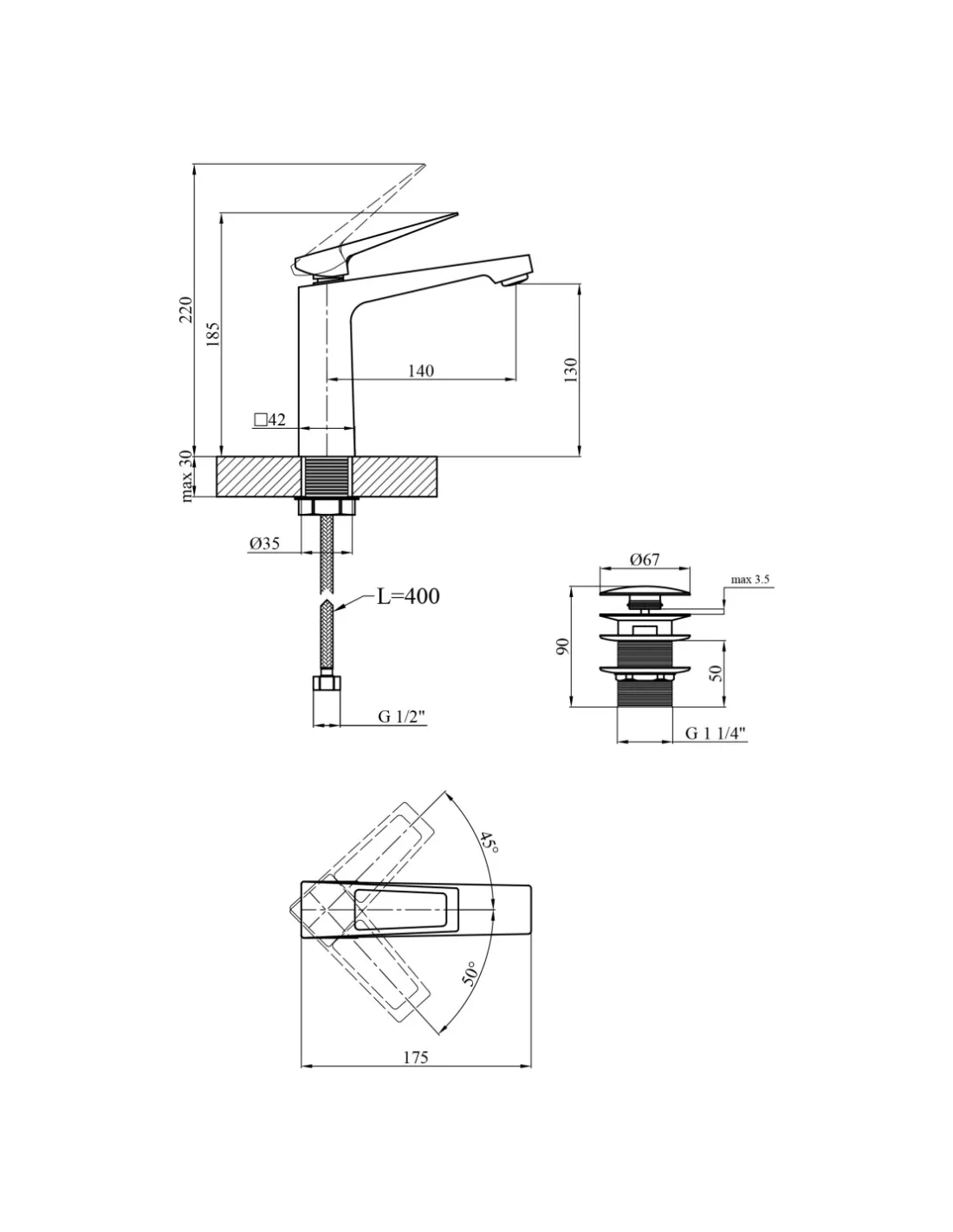- Висота всього змішувача: 175 мм,