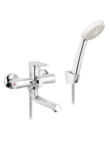 Змішувач для ванни Kroner KRM Elbe - C060 - призначений для регулювання температури та подачі води із встановленим напором у ванній кімнаті. Використовується у ванній кімнаті для ванни та умивальника. Виготовлений із силуміну, фактура поверхні – глянсова. Кран має сучасний дизайн, простий у встановленні та використанні. Установка зовнішнього типу на стіну за допомогою двох гайок (ексцентриків). Змішувач обладнаний європейським перемикачем води з крана на душову лійку, що підкреслює його функціональність. Довжина виливу 145 мм. Виливши поворотного типу, що дозволяє його використовувати і для ванної і для умивальника. У комплекті також поставляється душовий шланг, лійка та кріплення до стіни для ручного душу. Управління краном – одноважільне, також важіль використовується для регулювання температури та напору подачі води. Тип підключення – жорсткі підводи для води. Гарантія на виріб 36 місяців. Країна виробник - Німеччина.