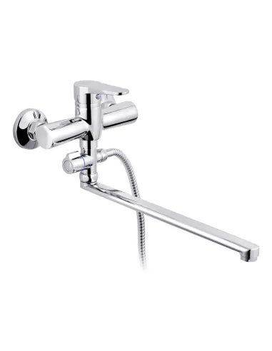 Змішувач для ванни Kroner KRM Elbe - C072 - призначений для регулювання температури та подачі води із встановленим напором у ванній кімнаті. Використовується у ванній кімнаті для ванни та умивальника. Виготовлений із силуміну, фактура поверхні – глянсова. Кран має сучасний дизайн, простий у встановленні та використанні. Установка зовнішнього типу на стіну за допомогою двох гайок (ексцентриків). Змішувач обладнаний європейським перемикачем води з крана на душову лійку, що підкреслює його функціональність. Довжина виливу 330 мм. Виливши поворотного типу, що дозволяє його використовувати і для ванної і для умивальника. У комплекті також поставляється душовий шланг, лійка та кріплення до стіни для ручного душу. Управління краном – одноважільне, також важіль використовується для регулювання температури та напору подачі води. Тип підключення – жорсткі підводи для води. Гарантія на виріб 36 місяців. Країна виробник - Німеччина.