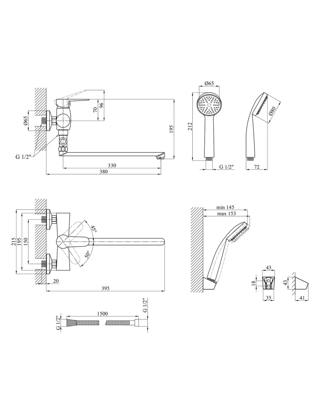 - Відстань між виводами під воду: 150 мм,