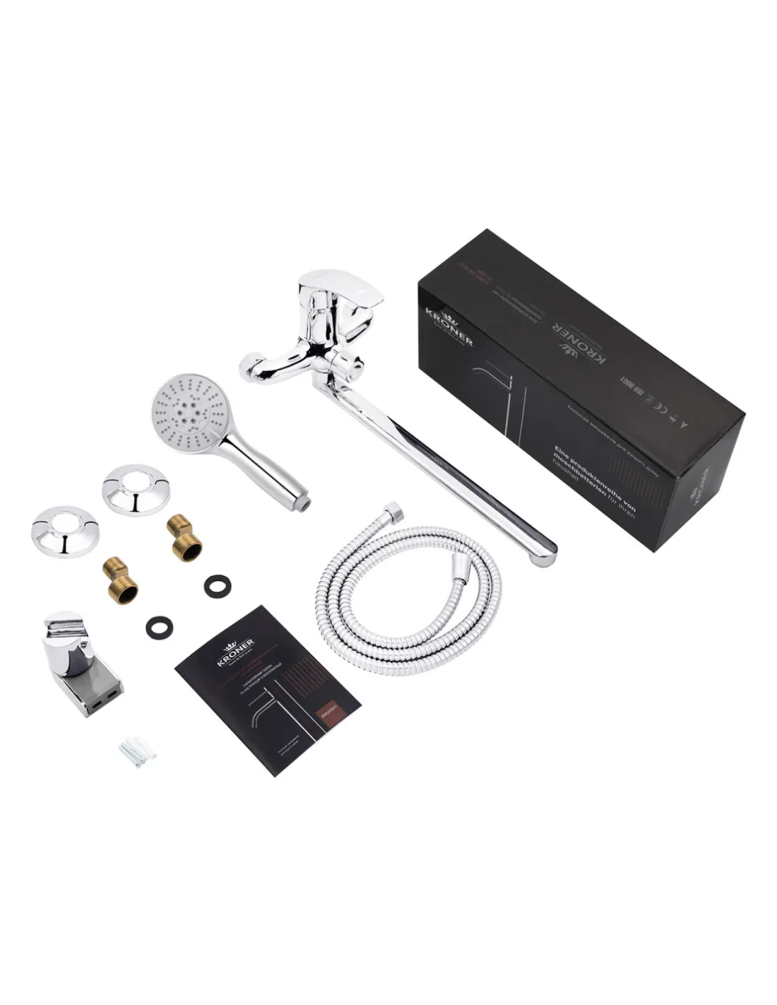 Змішувач для ванни Kroner KRP Konstante - C072 з душовим набором - це поєднання зручності, надійності та високої функціональності при використанні у ванній кімнаті. Призначений для регулювання температури, напору води та подачі її через кран або ручну душову лійку.