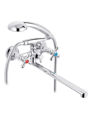 Змішувач для ванни Kroner KRP Royce - C072 з душовим набором - призначений для регулювання температури та подачі води із встановленим напором у ванній кімнаті. Використовується у ванній кімнаті для ванни. Виготовлений з латуні, фактура поверхні – глянсова. Кран має сучасний дизайн, простий у встановленні та використанні. Встановлення зовнішнього типу на стіну за допомогою ексцентриків. Змішувач обладнаний вентильним механізмом з кран-буксою та євро перемикачем води з крана на душову лійку, що наголошує на його функціональності. Довжина виливу 330 мм. Виливши поворотного типу, що дозволяє його використовувати і для ванної. В комплекті також поставляється душовий шланг довжиною 1500 мм, лійка ручна діаметром 80 мм і кронштейн для ручного душу. Управління краном – вентильне. Тип підключення – жорсткі підводи для води. Гарантія на виріб 60 місяців. Країна виробник - Німеччина.