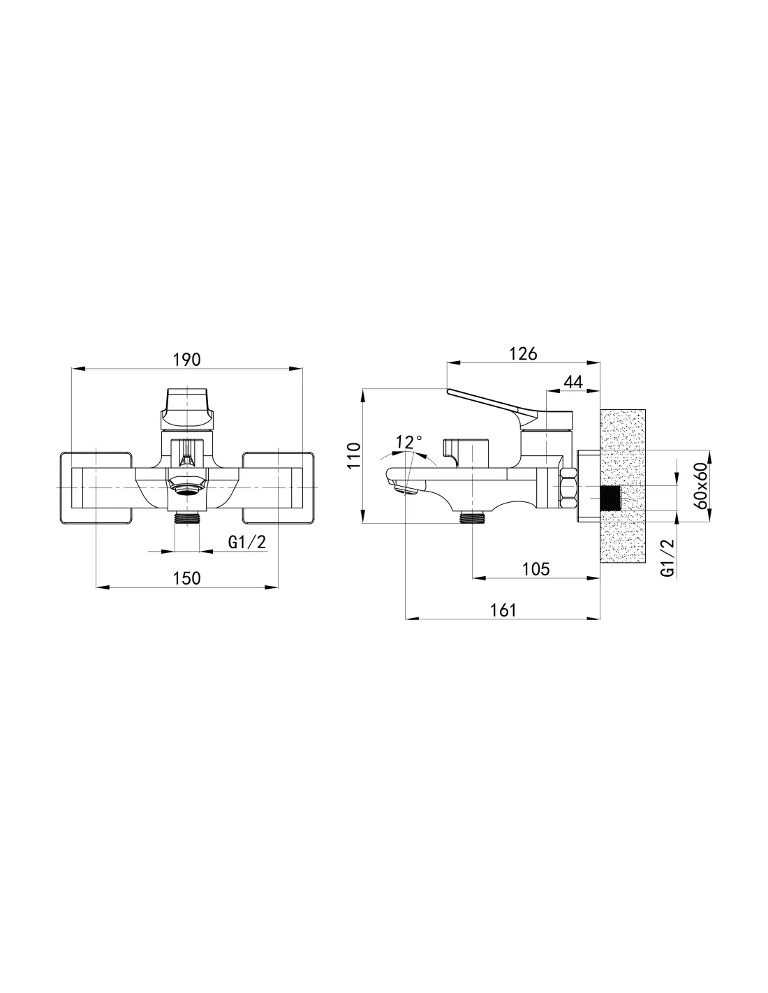 - Відстань між виводами під воду: 150 мм,