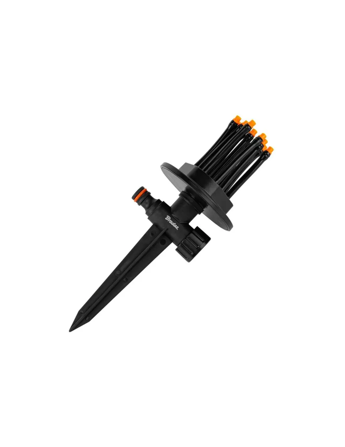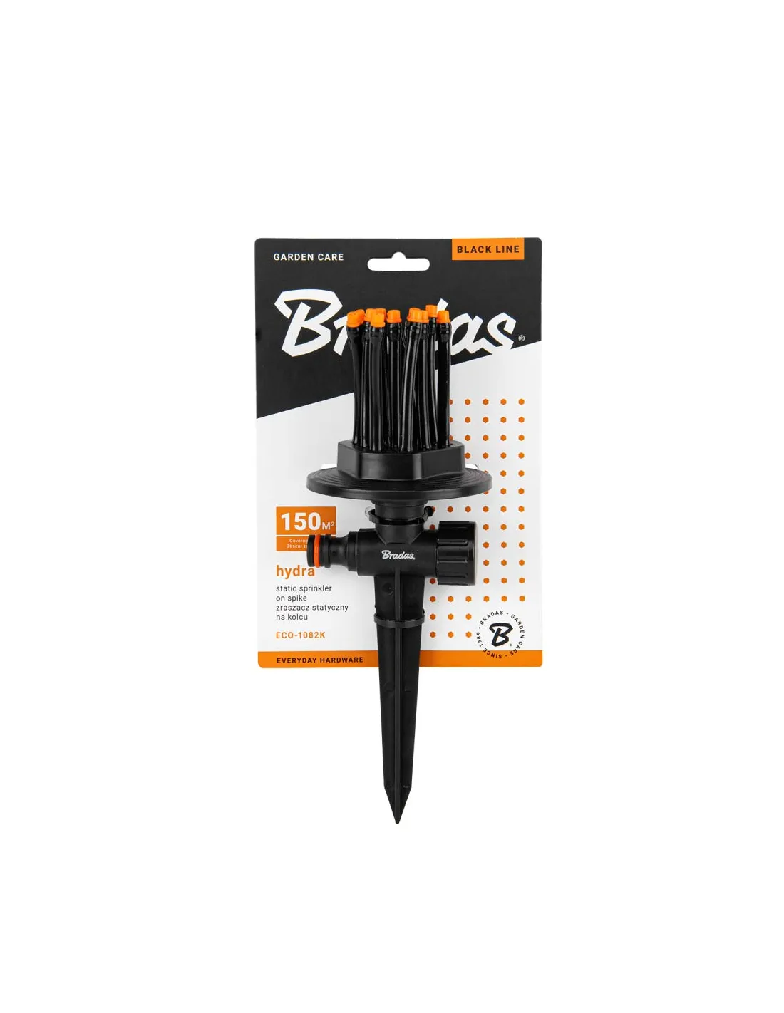 Зрошувач Bradas Hydra Black Line, ECO-1082K - статичний зрошувач на кілочку з регульованою зоною поливу від 0 до 360 градусів. Складається з 12 регульованих кронштейнів із форсунками, які під тиском води розпорошують її рівномірно по всій ділянці. Застосовується для ефективного поливу полів, газонів, грядок тощо.